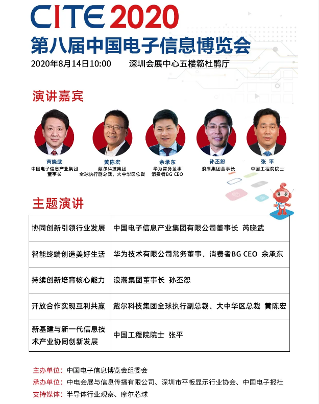 ?2020年8月14日-16日在深圳市將舉辦第八屆中國電子信息博覽會,并于2020年8月14日在深圳會展中心舉行“第八屆中國電子信息博覽會開幕式暨中國電子信息行業(yè)企業(yè)家峰會”。